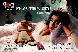 MAÑANA, TOMORROW, DEMAIN! May 15, 2011March 6, 2017 CLOWN ME IN PRESENTS: “PERHAPS, PERHAPS, QUIZÁS…” AT LA ESCALERA DE JACOB IN MADRID. C/ LAVAPIES 11 8PM 7€ http://perhapsperhapsclown.blogspot.com/p/show.html Share this: Click to share on X (Opens in new window) X Click to share on Facebook (Opens in new window) Facebook Like Loading... Related