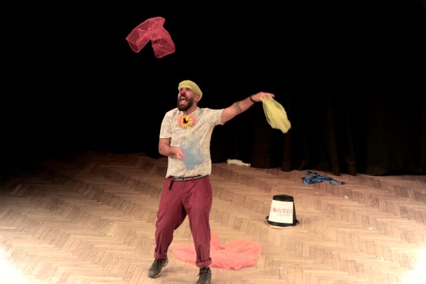 One of the clowns defies our expectations by embracing the challenges of balancing on a rope laid on the floor. Another challenges our intelligence and the acceptance of failure by trying to put juggling balls in a bucket.