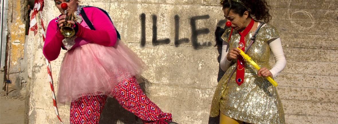 We have teamed up twice with Clowns Without Borders in Lesvos, once in 2015 and then again in 2016. Both times we performed for thousands of stranded Syrian refugees over the course of several weeks. You can read more about it in our blog here. Or for more information take a look on Clowns Without Borders’ website here and here.
