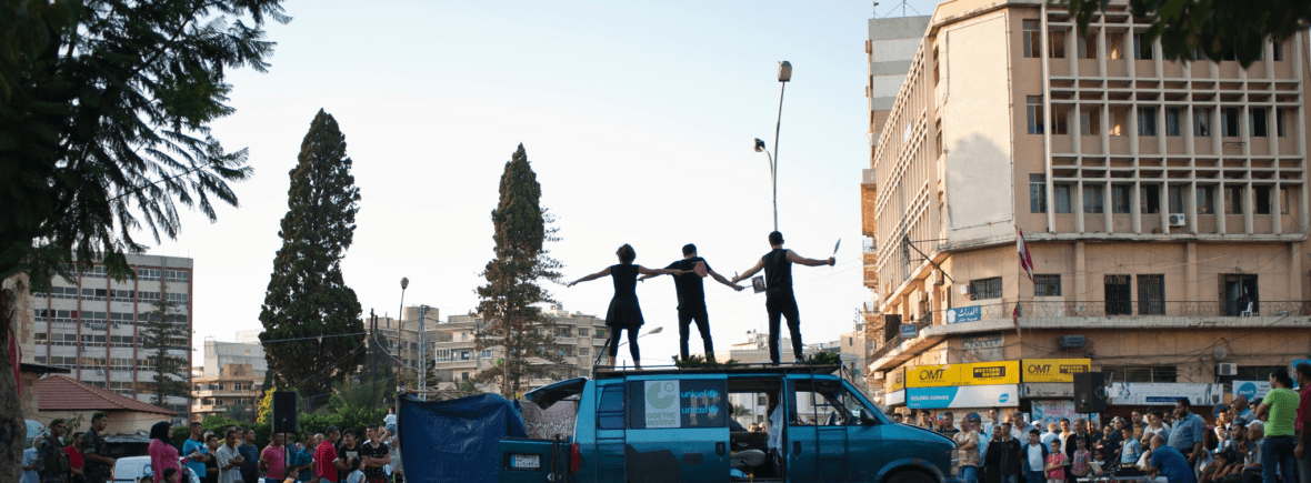 With The Caravan we toured 40 different Lebanese villages and Syrian refugee camps with two different casts ( Syrian refugees from the Bekaa valley and Syrian refugees’ actors). We also performed in Sfax (Tunisia) as part of “Sfax the capital of culture” street theatre festival, kerkenna and Nabeul in August 2016. And as part of the JTC ( Journees Theatrale de Carthage) in November 2016.
