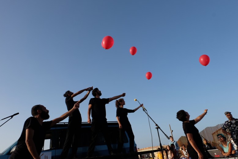 The Caravan is a 30min participatory street performance based on eight recorded stories of Syrian refugees living in Lebanon.