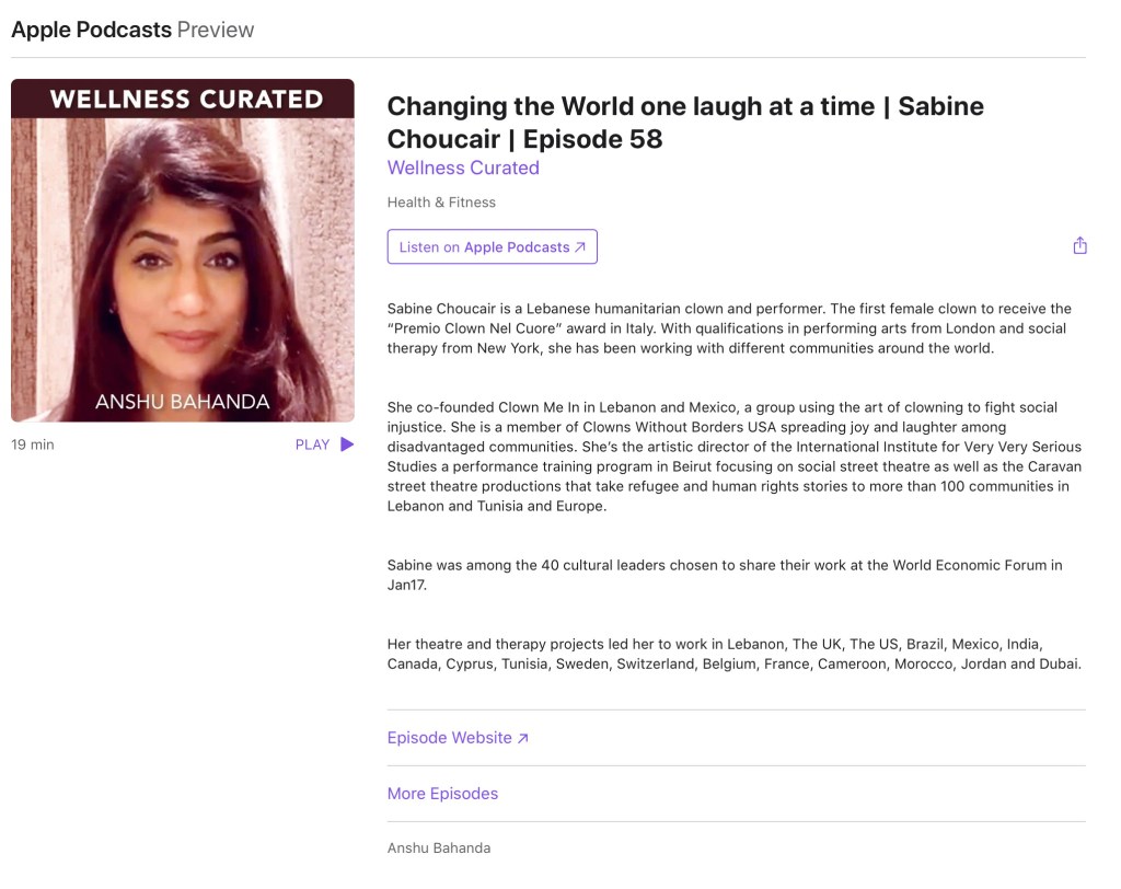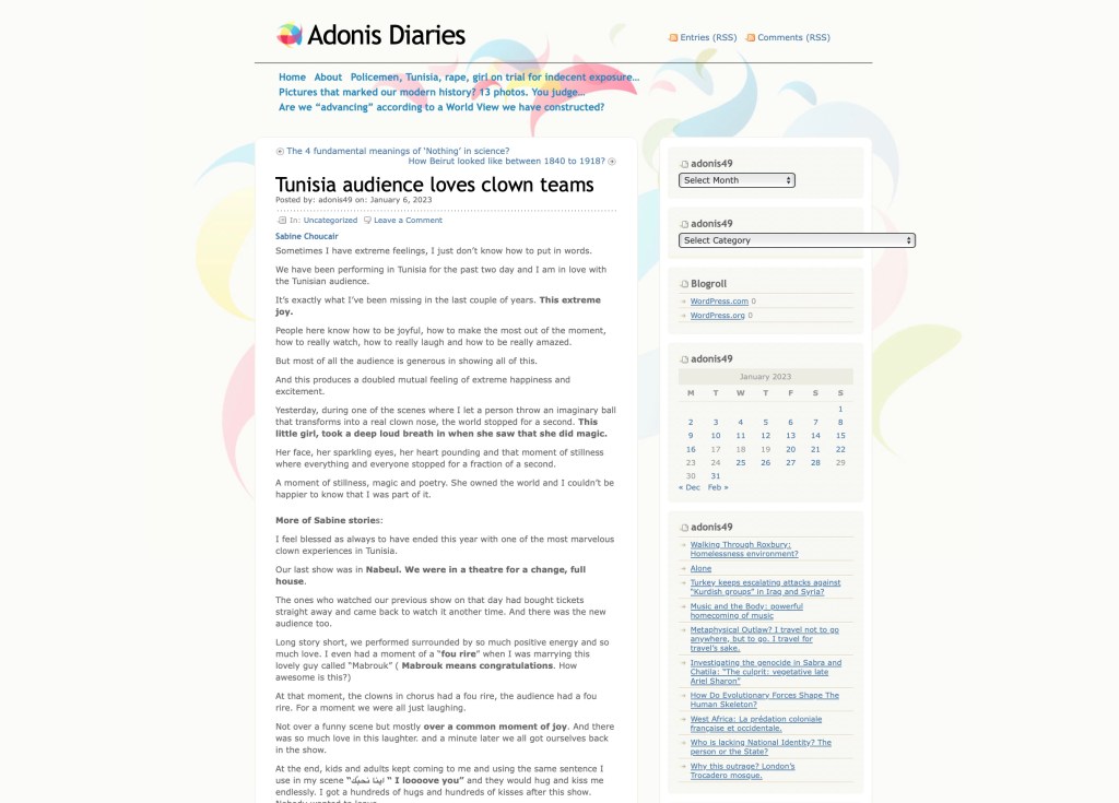 Press 2022 Al Jazeera https://www.facebook.com/watch/?v=505474664107073 Wellness Curated by Anshu Bahanda https://podcasts.apple.com/gb/podcast/changing-the-world-one-laugh-at-a-time-sabine/id1551279981?i=1000553260636 BAAB – RICA FESTIVAL Original Arts & Culture ADFE Al Arabiya DAPRE AUB National News Agency Lebanon Beirut City Guide Al Akhbar Nidaa al Watan Beirut News Network Nidaa Al Watan interview Adonis Diaries – Tunisia Tour Tunisia audience loves clown teams Abbasiye Communication Committee https://www.facebook.com/story.php/?story_fbid=pfbid02vEQ2gugvzeZQVAj4ou9VwFNYMf11dP28yickBaRPamrjpbt5MvXubetPcu4JyoUql&id=100083052920827&paipv=0&eav=Afbt30O0jS29TNJj0NmBGb_fxE30e51d9_lCCfJQOxS0ki4TXmeBKnFRHq6W3x5TMng&_rdr Share this: Share on X (Opens in new window) X Share on Facebook (Opens in new window) Facebook Like Loading...